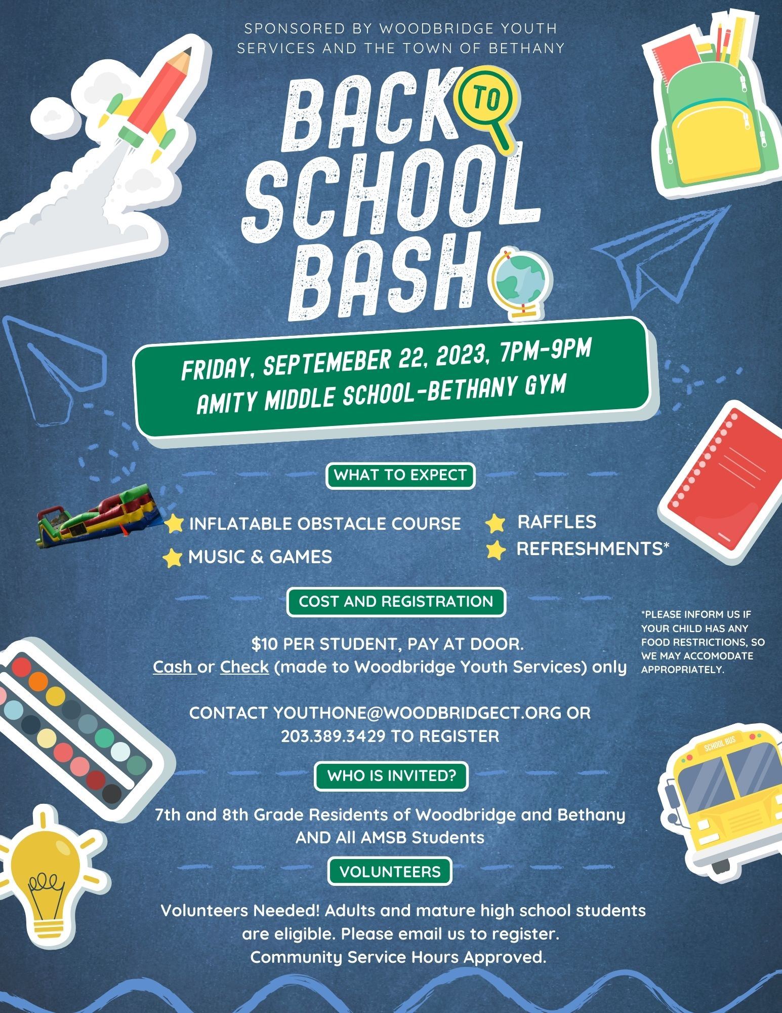 All 7th and 8th grade residents of Woodbridge and Bethany and all Amity Middle School Bethany students are invited to attend the Back to School Bash at AMSB on Sept. 22, 7 pm - 9 pm!